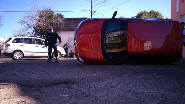 Una Volkswagen Suran chocó contra un Renault Clío, provocando que este último dé un semi trompo y vuelque sobre el lateral izquierdo. Los conductores no sufrieron lesiones, pero la acompañante que viajaba en la Suran debió ser trasladada al hospital Masvernat, ya que presentaba un golpe en la cabeza.