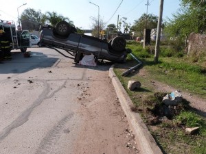 Una Pick-Up Chevrolet perdió el control y terminó volcada contra el cordón tras impactar contra una columna del alumbrado. Como consecuencia del violento accidente, el
