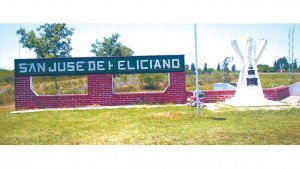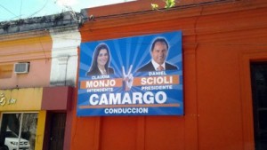 Villaguay. Esquina de Urquiza y San Martín. Un enorme cartel muestra a Claudia Monjo, esposa de Adrián Fuertes y candidata a intendente por el massismo,