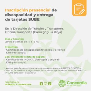 La Dirección de Tránsito y Transporte de la Municipalidad de Concordia informa que las empresas de transporte urbano de pasajeros aceptarán hasta el 30 de