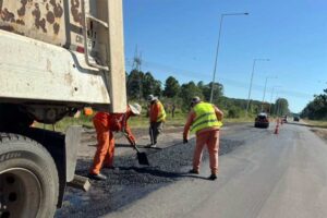 Varias cuadrillas de operarios realizaron trabajos de bacheo este viernes en el kilómetro 11 de la ruta A015, que conecta la ruta nacional 14 con