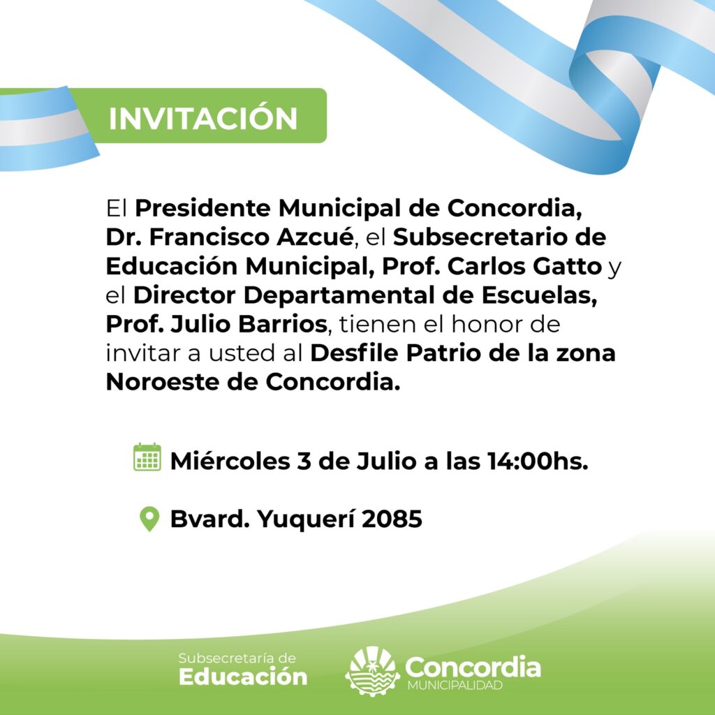 Este miércoles 3 de julio se llevará a cabo un Desfile Patrio en la zona noroeste, organizado por la Municipalidad de Concordia, a través de la Subsecretaría de Educación y la Dirección Departamental de Escuelas.