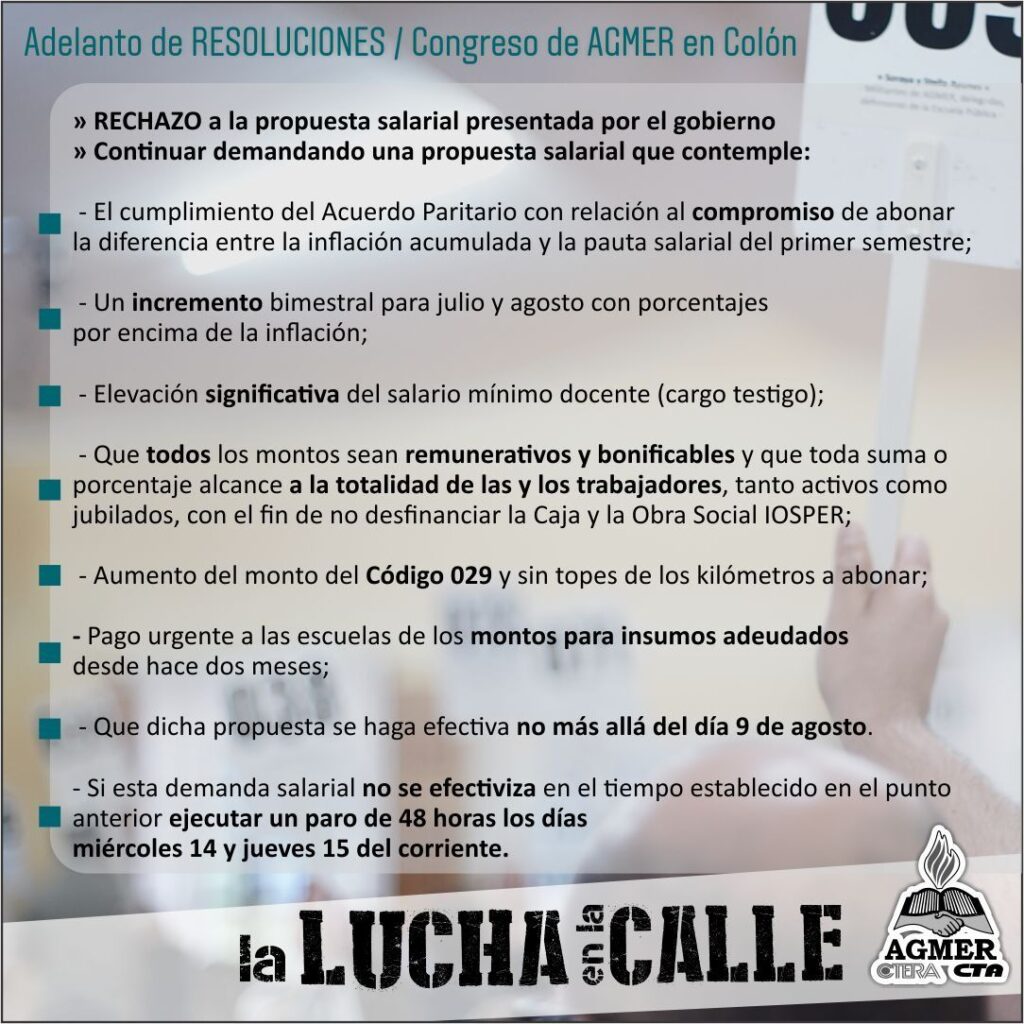 Agregó que el congreso que sesionó en Colón resolvió además «emplazar al Gobierno a que presente una propuesta no más allá del viernes 9 de agosto. Y posterior a eso los órganos institucionales del sindicato van a evaluar respecto a esa propuesta en la posibilidad de que en caso de que sea mejorada poder discutirla nuevamente en asamblea y en un congreso la semana próxima».