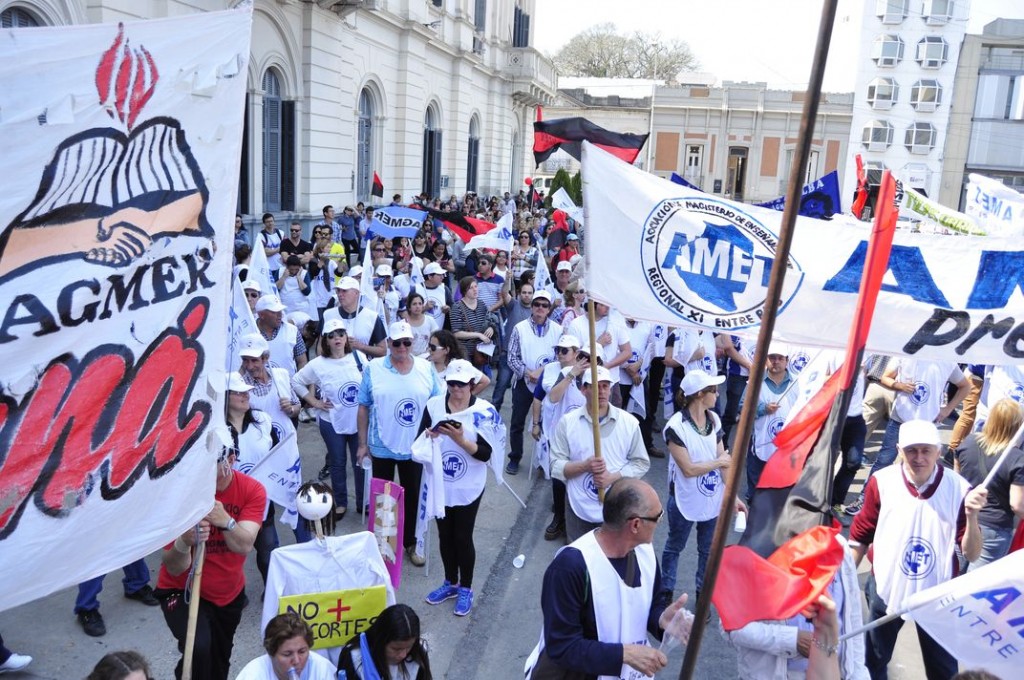 agmer2La Asociación Gremial del Magisterio de Entre Ríos (Agmer) en conjunto con los docentes técnicos nucleados en Amet, marcharon este jueves a la casa de Gobierno en reclamo de aumento de salarios. En cuanto al paro provincial, el gremio indicó a APFDigital que llegó a un 85 por ciento de adhesión. Hicieron uso de la pablara los secretarios generales de ambos sindicatos, Andrés Besel y Fabián Peccín, los discursos coincidieron en pedir que terminen las políticas de ajuste y la “persecución” por parte del Consejo General de Educación.