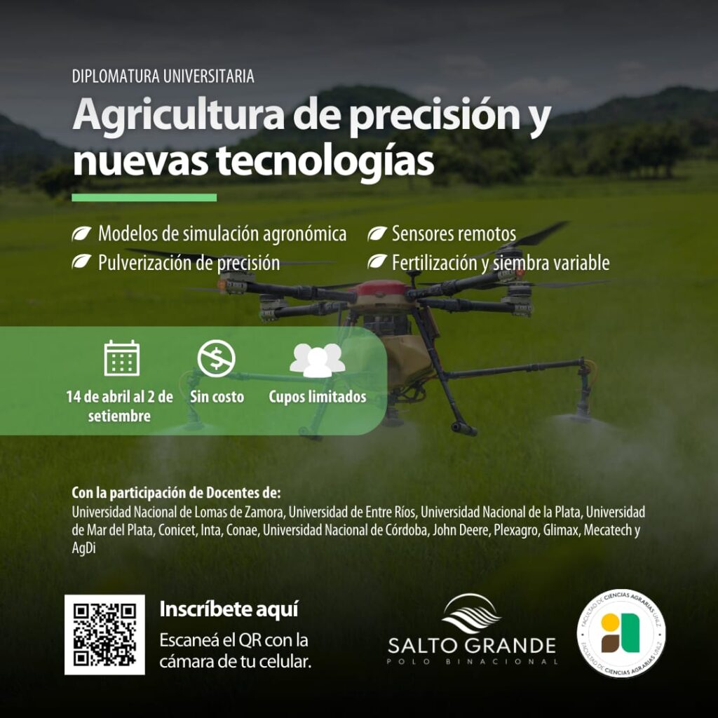Agricultura de Precisión y Nuevas Tecnologías para el Agro se desarrollará desde el 14 de abril hasta el 2 de septiembre, sin costo, con cuatro clases presenciales en Salto Grande y cinco módulos virtuales vía Zoom.