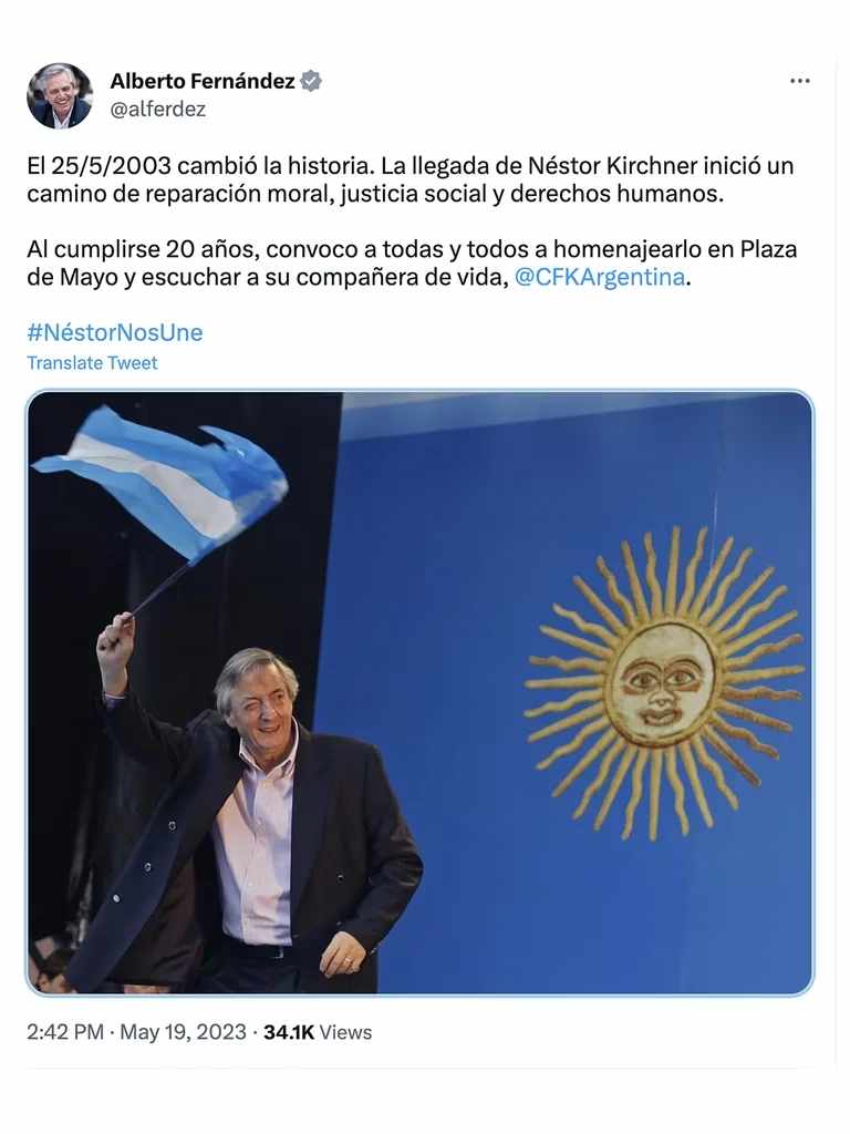 “El 25/05/2003 cambió la historia. La llegada de Néstor Kirchner inició un camino de reaparición moral, justicia social y derechos humanos. Al cumplirse 20 años, convoco a todas y todos a homenajearlo en Plaza de Mayo y a escuchar a su compañera de vida”, aseguró el jefe de Estado en un mensaje publicado en sus redes sociales.
