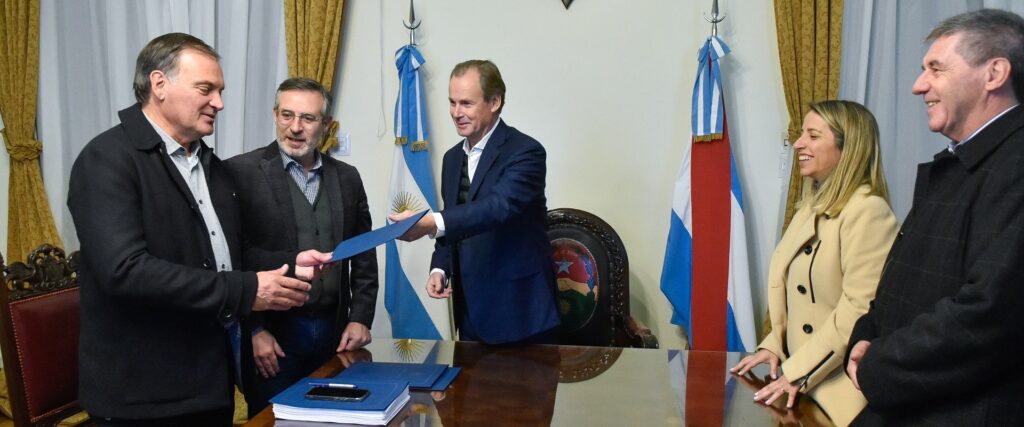 El mandatario, acompañado por la vicegobernadora Laura Stratta y el ministro de Economía, Hugo Ballay, recibió al intendente de San Salvador, Lucas Larrarte, para realizar el lanzamiento oficial de la licitación. También participaron el senador provincial Marcelo Berthet y el secretario de la Cámara de Industriales del Arroz, Roberto Pérez Mercader.