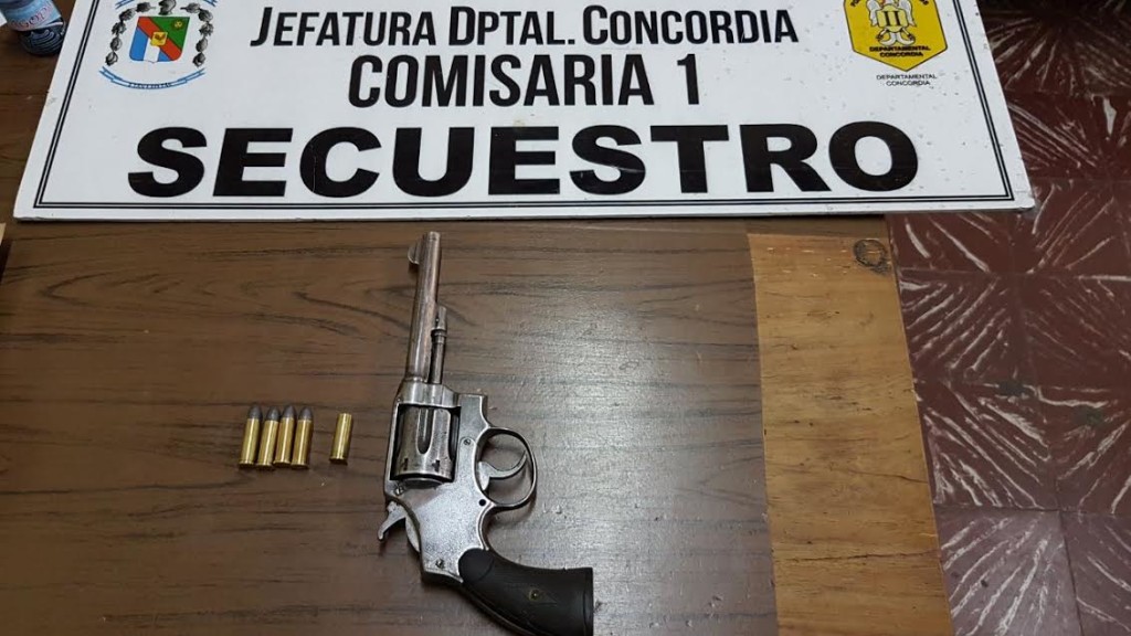 En el lugar, ven a dos jóvenes sentados, proceden al palpado, uno intenta darse a la fuga para el interior de una vivienda, rápidamente alcanzado por los funcionarios, al palparlo tenia entre sus ropas, un revolver calibre .38 largo, marca TEJON modelo 1929 «España», en buenas condiciones, con tubo cargador de 6 alveolos en su interior 04 cartucho calibre .38 y 01 vaina servida mismo calibre.- Luego de desarmarlo y neutralizarlo fue identificado como GONZALO, de 18 años, el otro masculino es un menor de menor de 17 años.- Se comunicó al fiscal, quien dispuso, secuestro del arma, entrega del menor a sus padres y la detención del mayor de edad y alojamiento del mismo en la sección alcaidía.-