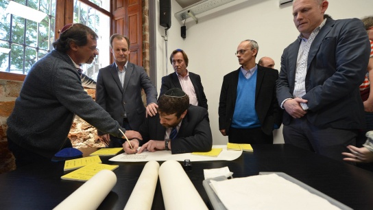 La Torá es el texto sagrado del judaísmo y su escritura fue realizada sobre un cuero especial, por el sofer Sebastián Grinberg y del rabino Salomón Nussbaum, Ellos se van trasladando por el país y completando como se hacía en las épocas milenarias, los pergaminos con el texto sagrado que se lee en cada ceremonia.