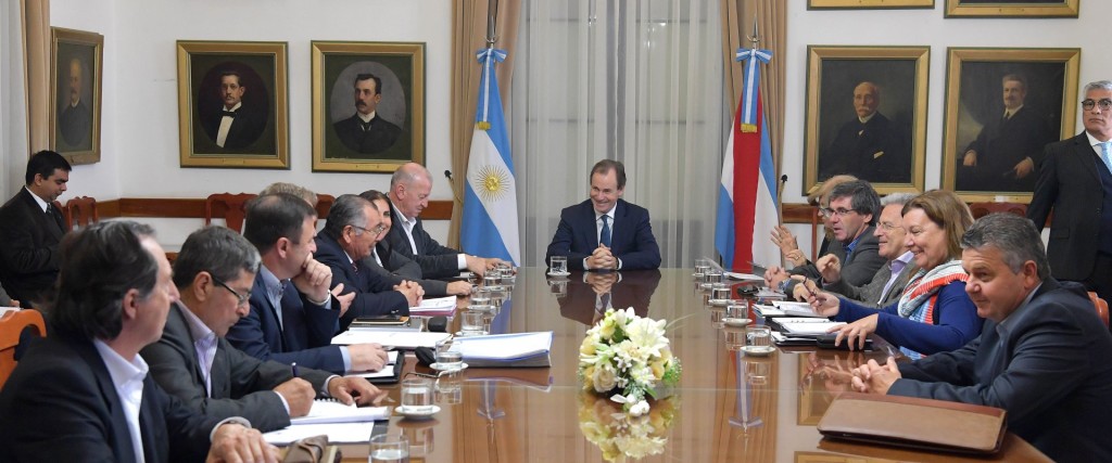 Junto a los ministros de Gobierno, Rosario Romero; de Economía, Hugo Ballay, y de Planeamiento, Luis Benedetto, además de la titular de la Dirección Provincial de Vialidad, Alicia Benítez, y del secretario de Energía y presidente de Enersa, Jorge González, el primer mandatario entrerriano recibió en el Salón de los Gobernadores a los intendentes de Federación, Carlos Cecco; Chajarí, Pedro Galimberti; Villa del Rosario, Gustavo Zandoná; Los Conquistadores, Edgardo Miño; San Jaime, Felipe Balcaza, y Santa Ana, Mario Toller. Los acompañaron el senador provincial Miguel Piana, y la diputada provincial Gabriela Lena, para conversar sobre obras en el norte entrerriano.