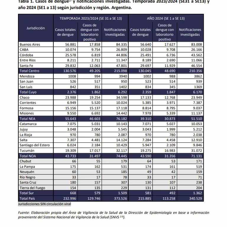 El Ministerio de Salud de la Nación informó que, en lo que va de la temporada 2023/2024 (semana 31 de 2023 -fines de julio y comienzos de agosto- hasta la semana 13 de 2024 -fines de marzo), se registraron en Argentina “232.996 casos de dengue (90% autóctonos, 7% en investigación y 3% importados), de los cuales 215.885 se registraron desde la semana 1 a la semana 13 de 2024″.