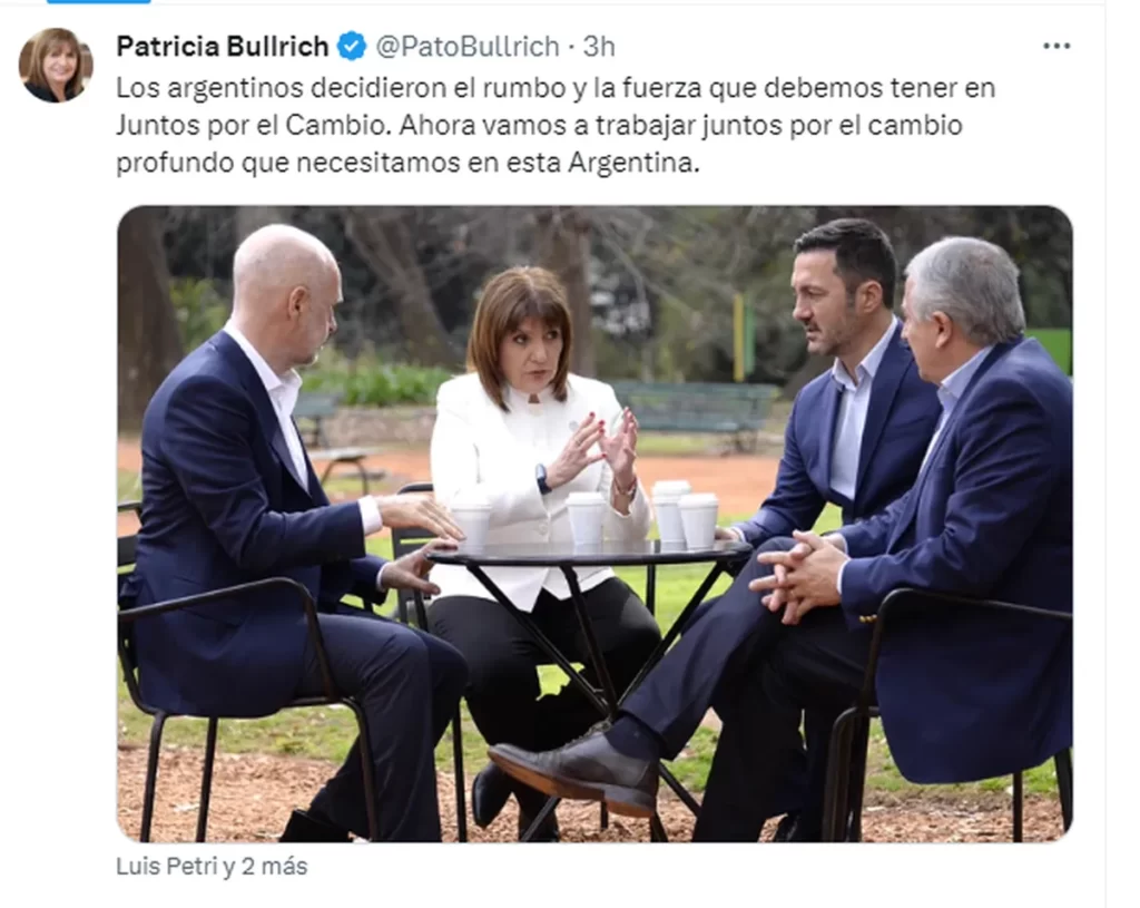“Los argentinos decidieron el rumbo y la fuerza que debemos tener en Juntos por el Cambio. Ahora vamos a trabajar juntos por el cambio profundo que necesitamos en esta Argentina”, publicó Bullrich en su cuenta de Twitter este mediodía.