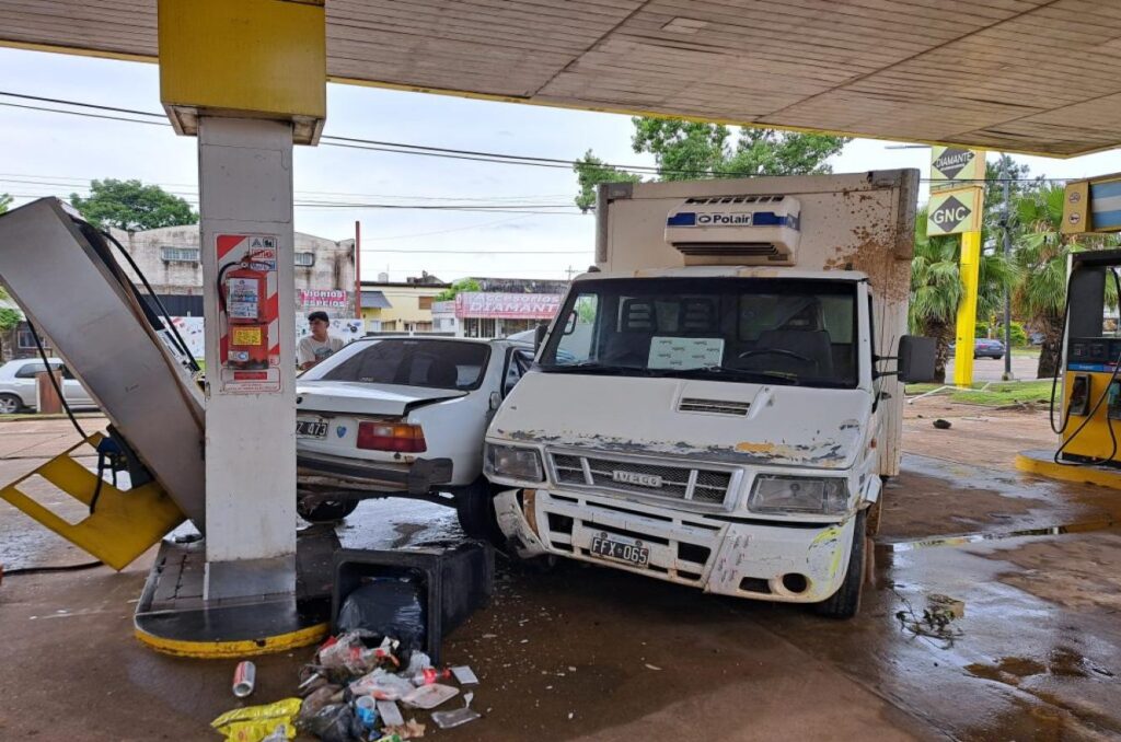 A pesar de su maniobra evasiva, el camión terminó impactando contra una baranda en la esquina de la estación de servicio «El Lago» (ex EG3). Posteriormente, el vehículo chocó contra un Renault 18, propiedad de un trabajador de la estación, que se encontraba por cargar combustible en ese momento. El impacto también provocó la destrucción de uno de los surtidores de la estación, consignó Concordia Policiales.