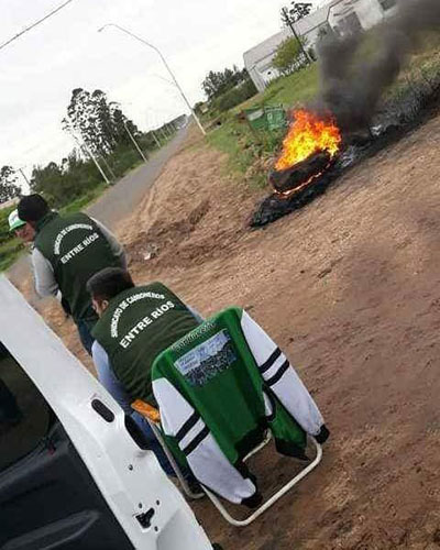 Referentes del Sindicato de Camioneros Entre Ríos que lidera el ex diputado provincial, Antonio Alizegui, y que responde a nivel nacional al liderazgo de Hugo Moyano, protestan con quema de gomas en Avenida Belgrano casi Ruta 2 de Chajarí, donde se encuentra la vivienda familiar del empresario del transporte Sergio Villanova.