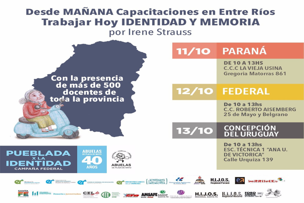 La iniciativa partió de la filial de Abuelas Rosario y se denomina Pueblada x la Identidad. Bajo el lema: “Encendiendo verdades en los pueblos argentinos”, tiene como objetivo llevar el mensaje de búsqueda a todo el territorio nacional, realizando actividades culturales, educativas y deportivas, a partir de las propuestas que acerquen y articulen las instituciones involucradas, e invitando a otras a sumarse (clubes, escuelas, vecinales).