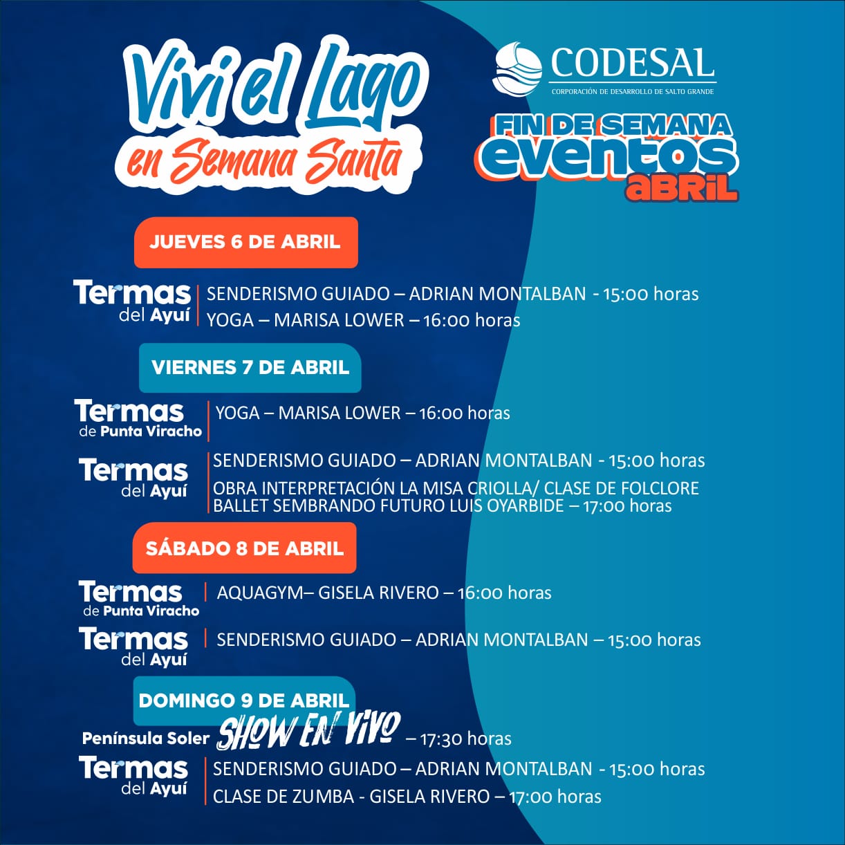 Con muy buenas perspectivas para la Semana Santa y con la capacidad hotelera casi en un 100 por ciento de ocupación en Concordia, la Corporación de Desarrollo de Salto Grande planificó varias actividades para ofrecer alternativas de diversión en las termas de Ayuí, Punta Viracho y en playas del lago.