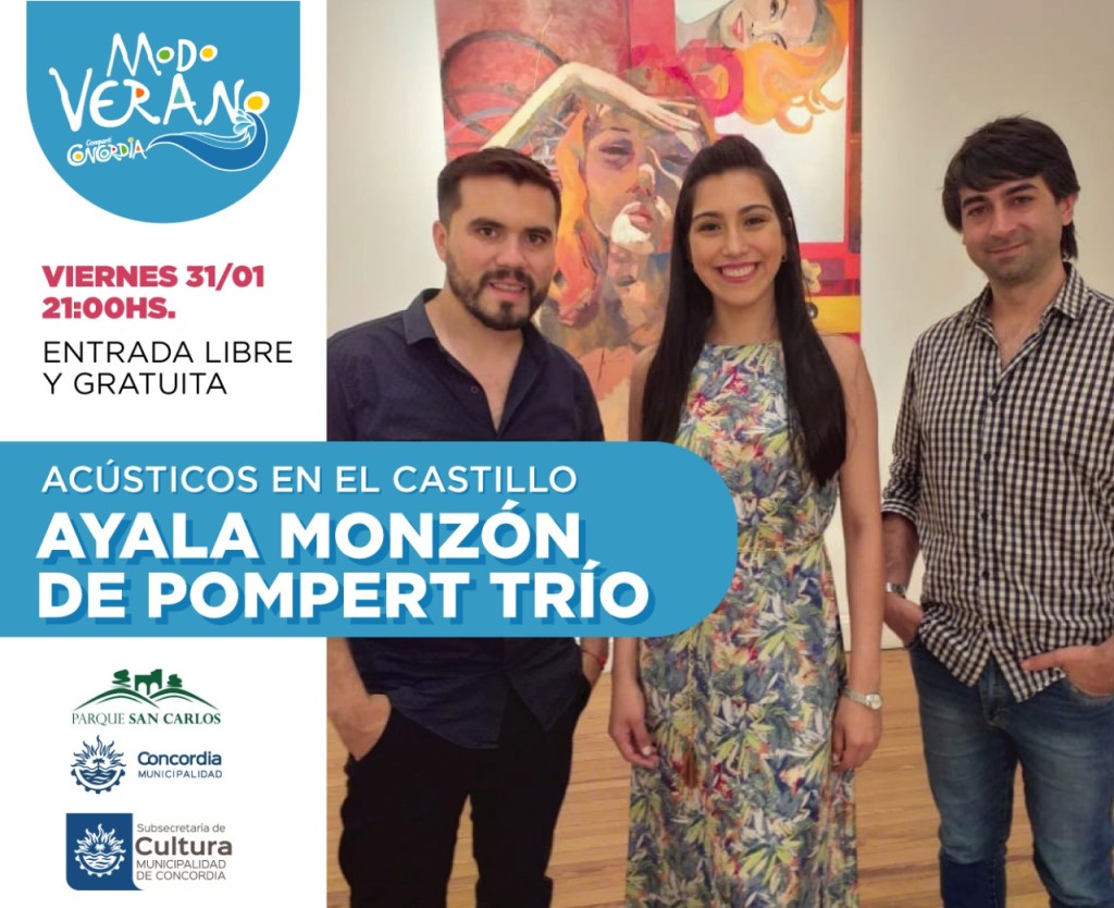 Acústicos de Verano en el Castillo San CarlosHoy viernes 31 de enero a las 21 hs el Castillo San Carlos recibe al Trío Ayala – Pompert – Monzón para el inicio del ciclo Acústicos 2020. Con entrada libre y gratuita se podrá disfrutar de una gran velada musical con el paisaje del Castillo y el Parque San Carlos como escenario, en una noche imperdible.