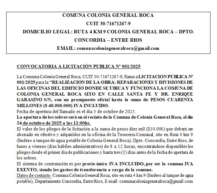 La Comuna Colonia General Roca, CUIT 30-71671267-9, llama a LICITACION PUBLICA Nº 001/2025 para la “REALIZACION DE LA OBRA: REPARACIONES Y DIVISIONES DE LAS OFICINAS DEL EDIFICIO DONDE SE UBICA Y FUNCIONA LA COMUNA DE COLONIA GENERAL ROCA SITO EN CALLE SANTA FE Y DR. ENRIQUE GARASINO S/N, con un presupuesto oficial hasta la suma de PESOS CUARENTA MILLONES ($ 40.000.000) IVA INCLUIDO.