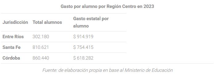 Según los datos disponibles hasta el año 2023 proporcionados por el entonces Ministerio de Educación (actualmente Ministerio de Capital Humano), es posible conocer el nivel de inversión educativa y el gasto por alumno en los niveles inicial, primario y secundario. De dicho relevamiento se observa que la provincia de Entre Ríos presenta la mayor inversión por estudiante, con un monto superior a los $900.000 anuales, seguida por Santa Fe y, en último lugar, Córdoba, con aproximadamente $700.000 y $600.000 respectivamente. Estos valores contemplan el gasto total en educación, que incluye los gastos en personal, bienes y servicios no personales, transferencias a instituciones privadas, erogaciones corrientes, de capital y otros componentes vinculados al sostenimiento del sistema educativo.