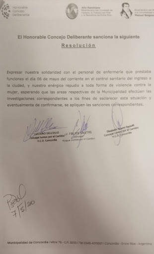 Tras conocerse que en control sanitario ubicado sobre Ruta 015, en la jornada del miércoles pasado, una integrante del personal de enfermería que presta colaboración en el lugar, fue agredida por quien se encontraba encargado de dicho operativo en ese momento, el bloque de concejales de Juntos por el Cambio presentó un proyecto de Resolución mediante el cual repudian este tipo de acciones contra las mujeres y expresan su solidaridad con dicho personal que tuvo que pasar por este lamentable episodio.