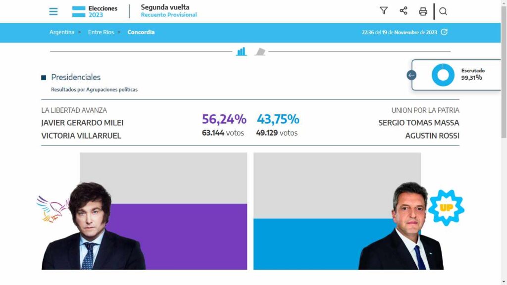 Para cerrar el cronograma electoral, Concordia se inclinó también por el candidato no peronista y en el balotaje, Javier Milei de La Libertad Avanza obtuvo 63.144votos (el 56,24%) sobre el oficialista Sergio Massa que obtuvo 49.129 votos, (43,75%).