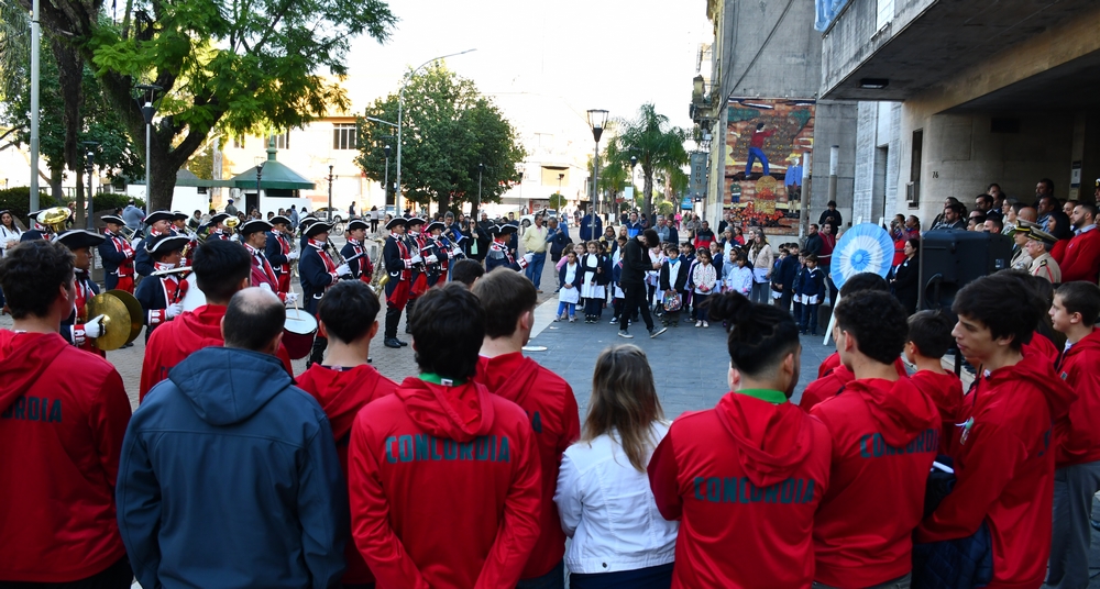 En el marco de las actividades planificadas por el municipio para las celebraciones del mes de Mayo se realizó esta mañana una nueva edición de “Concordia Late la Patria”. El acto contó con la participación de la Banda del Regimiento de Caballería de Tanques 6 Blandengues, alumnos y docentes de tercer grado de la escuela Diógenes de Urquiza, integrantes de la Selección de Básquet de Concordia, funcionarios del Gabinete Municipal, concejales y concejalas, fuerzas de seguridad e instituciones locales.