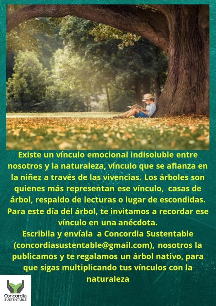 Por eso, convocan a escribir y enviar una anécdota relacionada con un árbol. Hay tiempo de enviarla hasta el sábado 29 de agosto, Día del Árbol, a través del correo electrónico concordiasustentable@gmail.com.