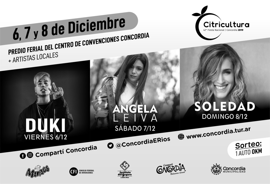 La Fiesta de la Citricultura se realizará el 6, 7 y 8 de diciembre, destacándose en su grilla artística las presentación de Duki, Angela Leiva y Soledad; junto a artistas locales en cada noche; así como también la elección de reinas, la expo comercial y el sorteo del automóvil 0 Km, al que se accederá adquiriendo el Bono Contribución que se pondrá a la venta en las primeras semanas de noviembre.