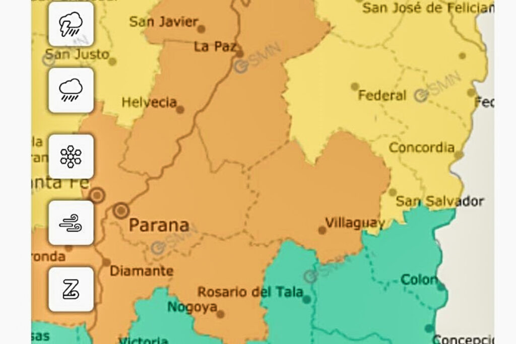 El Servicio Meteorológico Nacional informó una alerta amarilla para el norte entrerriano, destacando alerta naranja para el noroeste. El área será afectada por tormentas localmente fuertes o severas.