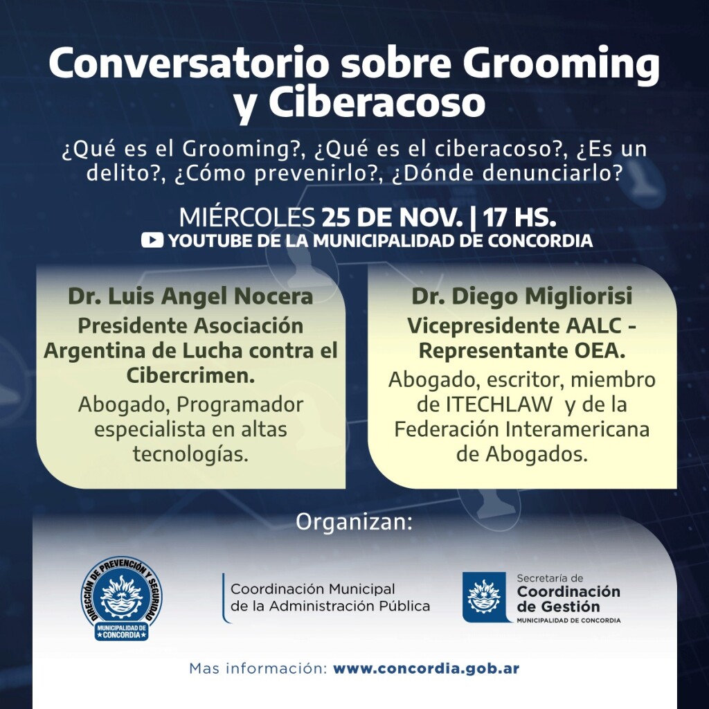 Este miércoles 25 de noviembre se realizará un conversatorio online sobre Grooming y CiberAcoso con destacados especialistas de la ONG Asociación Argentina de Lucha contra el CiberCrimen.