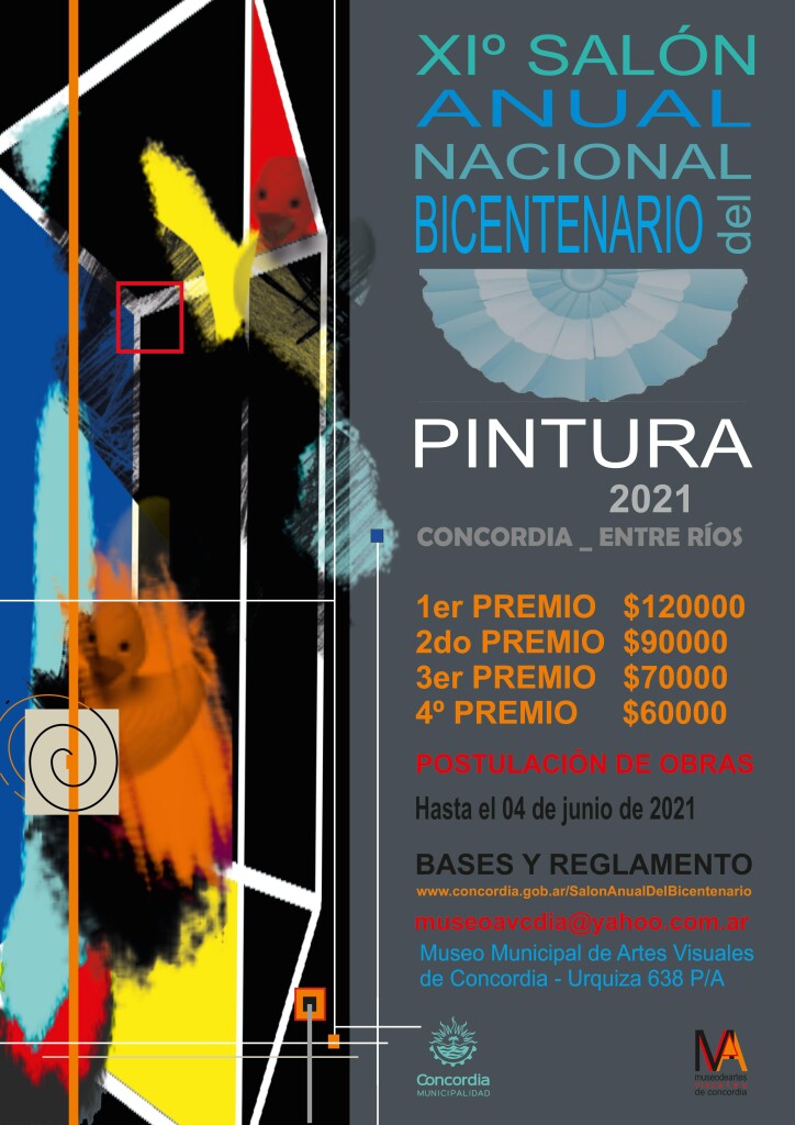 La Municipalidad de Concordia abre la convocatoria al XI Salón Anual del Bicentenario, que en este año 2021 estará orientado a la disciplina de la pintura. La convocatoria está abierta a todos los artistas plásticas argentinos o extranjeros con una residencia mínima de dos años en el país, y contempla premios adquisición por un total de 340 mil pesos.