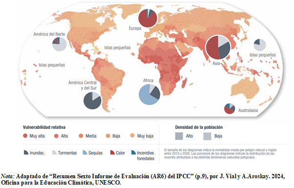 En las dos últimas décadas, las 55 economías más vulnerables al cambio climático han sufrido daños superiores a los 500.000 millones de dólares (Siegfried, 2023). En 2022, las catástrofes desencadenaron la cifra récord de 32,6 millones de desplazamientos internos, de los cuales el 98 % fueron provocados por desastres meteorológicos como inundaciones, tormentas, incendios forestales y sequías (ACNUR, 2023). Asimismo, en 2023 se registraron en los distintos hemisferios olas de calor, profundizando estos eventos la inseguridad alimentaria, agudizando la crisis hídrica e impactando en la salud de la población.