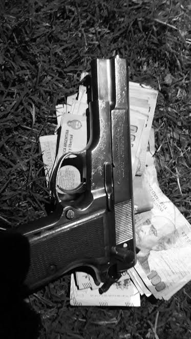 Sobre el suelo al costado del vehículo, lado del acompañante, se observó una pistola calibre 9 mm marca Parabellum Feg-Budapest, con sietes cartuchos en su almacén cargador y un cartucho en recamara, con su martillo montado, lista para ser utilizada, como así también esparcidos la suma de $14,500 (catorce mil quinientos pesos) diferenciados en billetes de $100 (cien). El Fiscal en turno Dr. Nuñez, dispuso el secuestro del arma de fuego y el dinero, además el trasladado y alojado del masculino que tiene pedido de captura a la sección alcaidía.