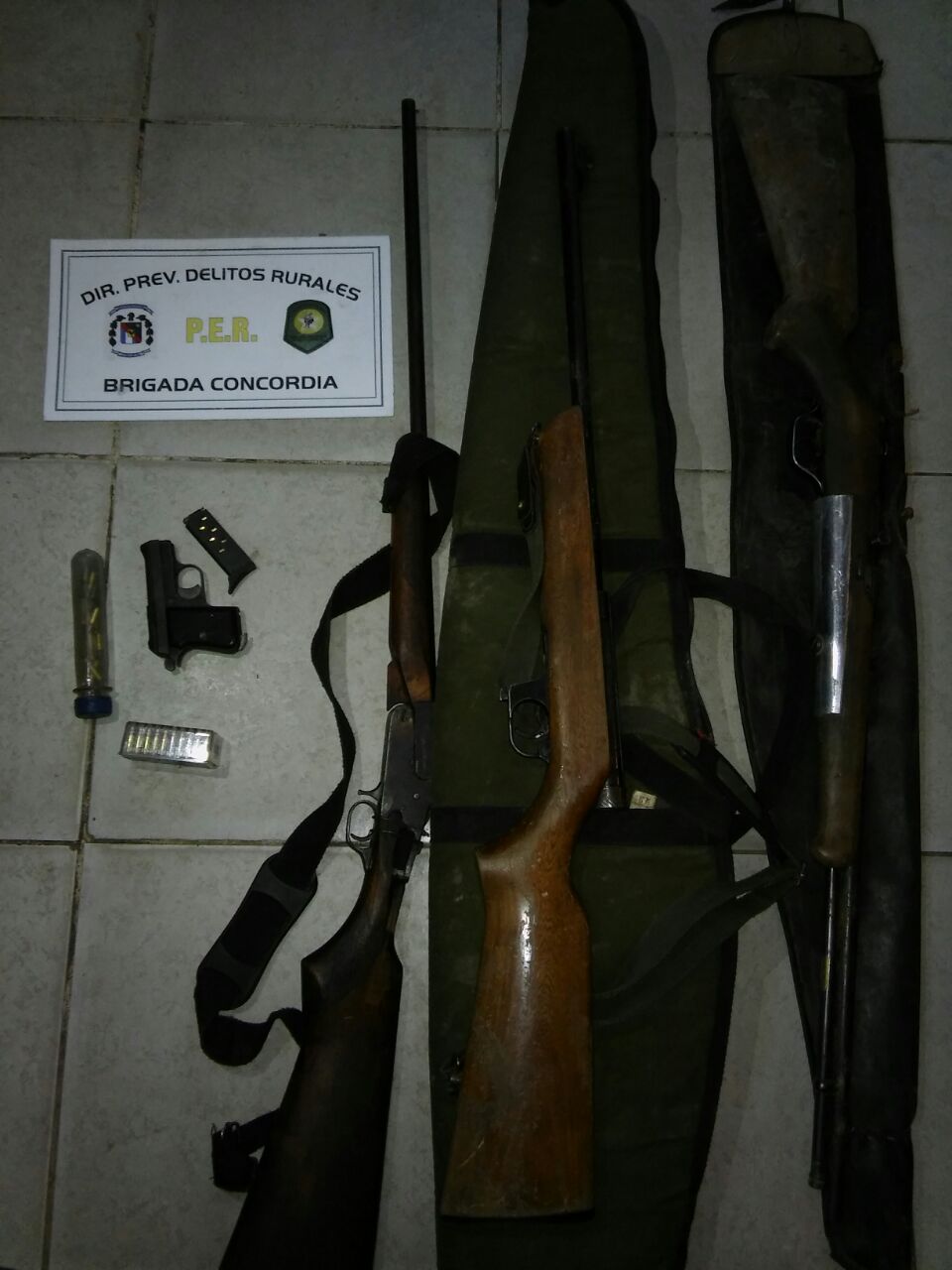 Al descender la totalidad de los ocupantes del vehículo, se visualizó que portaban armas de fuego, 3 armas largas y una de mano, sin documentación alguna, sin portar carnet de Legitimo Usuario y Tenencia. Llevaban también una conservadora y una bolsa de nylon con restos de carne de animal aparentemente de carpincho, cuchillos tipo carnicero y caja de cartuchos cal .22.