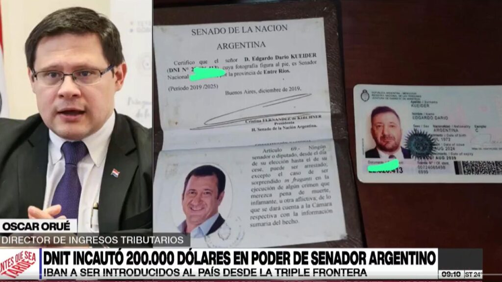 Detuvieron en Ciudad del Este, Paraguay, al senador nacional Edgardo Kueider con 200.000 dólares. La noticia la dio a conocer este miércoles Radio 1° de Marzo (780 AM), de la Megacadena. El Director de Ingresos Tributarios de Paraguay, Oscar Orué, explicó que la detención del senador Edgardo Darío Kueider se dio en un control rutinario en horas de la madrugada.