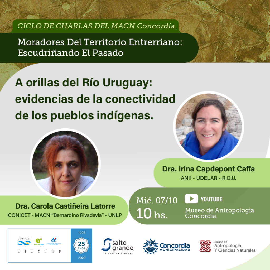 En esta ocasión y bajo el título “A orillas del rio Uruguay: evidencias de la conectividad de los pueblos indígenas” expondrán la Dra Irina CapdepontCaffa y la Dra Carola Castiñeira Latorre quienes presentarán los resultados de las investigaciones arqueológicas desarrolladas en las márgenes oriental (Departamentos de Artigas, Salto y Paysandú) y occidental (Departamento de Concordia) del río Uruguay.