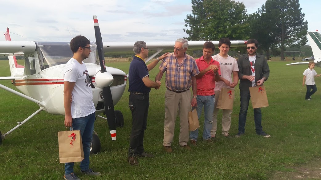 El presidente del Aeroclub Concordia, Luis Sorokin, y el vicepresidente Ignacio Baquero, entregaron sendos recordatorios a Alexis Bastián, Valentín Agüero y Maximiliano Martínez Massera tras haber atravesado exitosamente el examen de rigor para obtener la licencia de Piloto Privado de Avión.