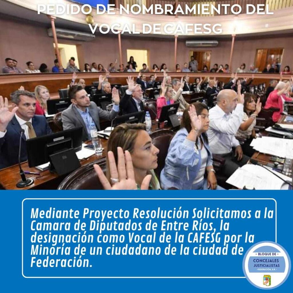 El Concejo Deliberante de Federación, a través de un Proyecto de resolución, solicitó a la Cámara de Diputados de la Provincia de Entre Ríos la designación como Vocal de CAFESG por la Minoría, de un ciudadano de esa ciudad.