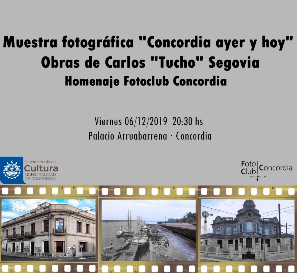 Este viernes 6 de diciembre, en el Palacio Arruabarrena, a las 20:30 hs quedará inaugurada la muestra fotográfica “Concordia ayer y hoy”, en homenaje al fotógrafo Carlos “Tucho” Segovia. La misma es organizada por el Fotoclub Concordia y cuenta con el apoyo de la Subsecretaria de Cultura de la Municipalidad de Concordia. La entrada es libre y gratuita.