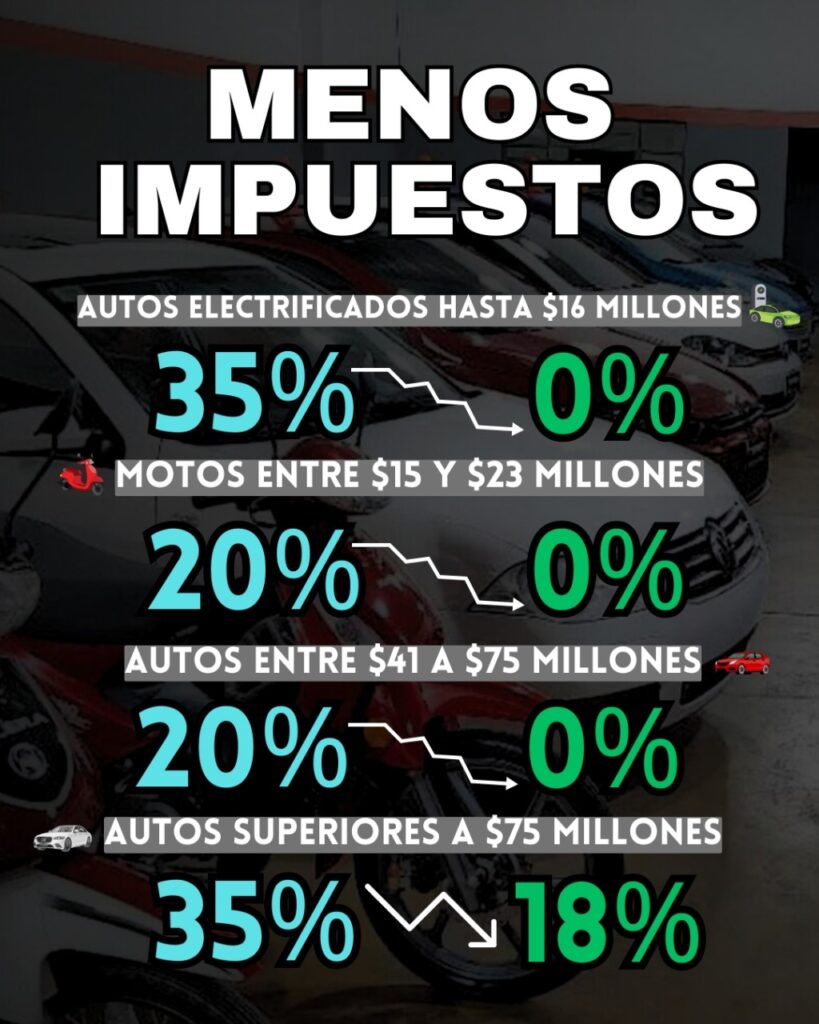“Se eliminarán los impuestos internos para los autos de entre 41 y 75 millones de pesos, que hasta ahora pagaban una alícuota del 20% y se reducirá la alícuota para los autos de más de 75 millones, del 35% al 18%”, agregó el funcionario.