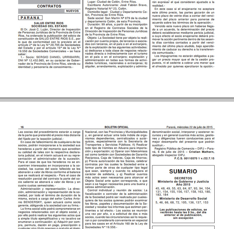 La fecha de constitución de Salud Entre Ríos SE, que tendrá 50 años de duración, fue el 23 de junio. Su objeto principal será “la administración general y la prestación de los servicios de salud, para fortalecer las capacidades sanitarias a nivel sistémico y mejorar las condiciones socio-sanitarias de la población”.