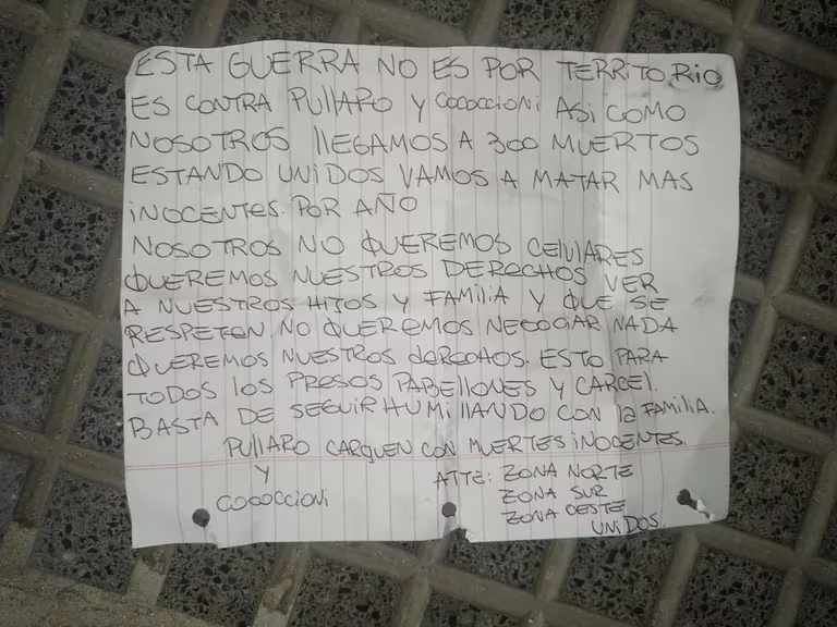 “Esta guerra no es por el territorio, es contra Pullaro y Cococcioni”, comienza diciendo el mensaje del crimen organizado y continúa: “Así como nosotros llegamos a 300 muertos, estando unidos vamos a matar a más inocentes por año”. Esa mención a la unión es lo que llevó enorme preocupación, porque confirmó las versiones que habían en el mundo de la delincuencia de Rosario. “Nosotros no queremos celulares, queremos nuestros derechos ver a nuestros hijos y familia y se respeten. No queremos negociar nada, queremos nuestros derechos. Esto para todos los presos, pabellones y cárcel”, siguió la nota amenazante.