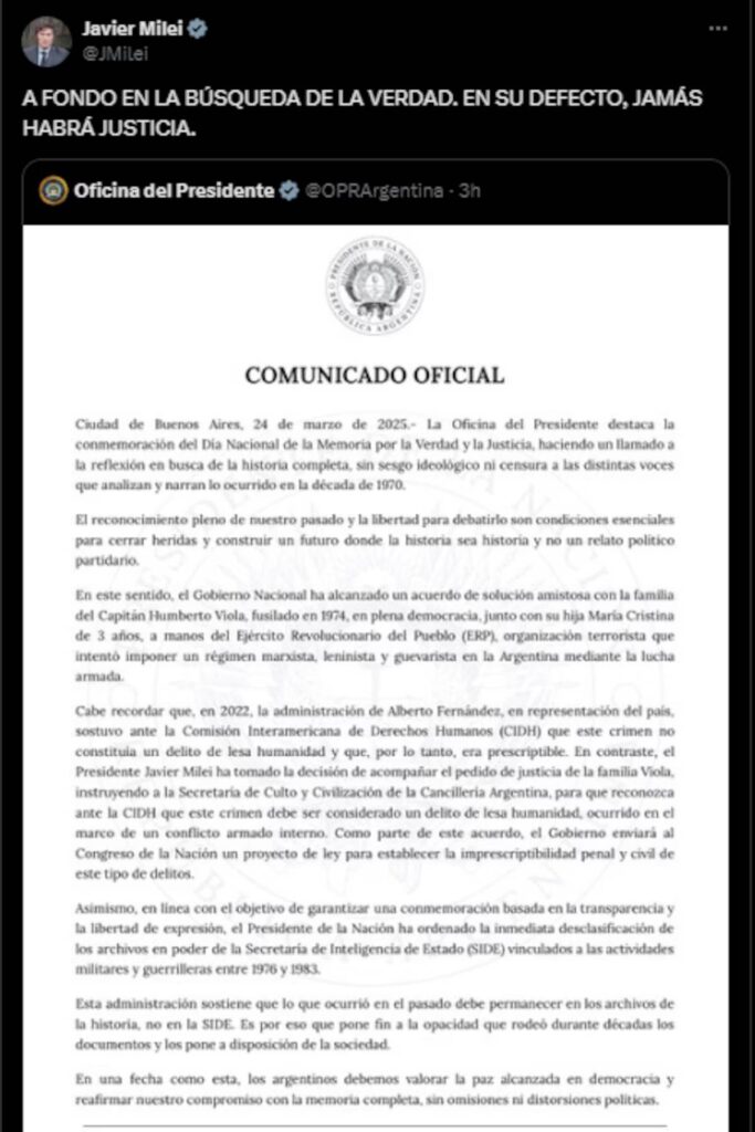 “Bajo la presidencia de Javier Milei, habiéndose revisado los antecedentes del caso, se decidió entablar diálogo con la familia, llegando a un acuerdo histórico de solución amistosa, donde se revierte la mirada sesgada e ideologizada que sostuvieron gobiernos anteriores respecto a los trágicos sucesos de la década del 70′, agregó. Para el Presidente Javier Milei, de acuerdo a lo que manifestó Adorni, “el asesinato del capitán Viola y su familia constituyó un crimen de lesa humanidad”.
