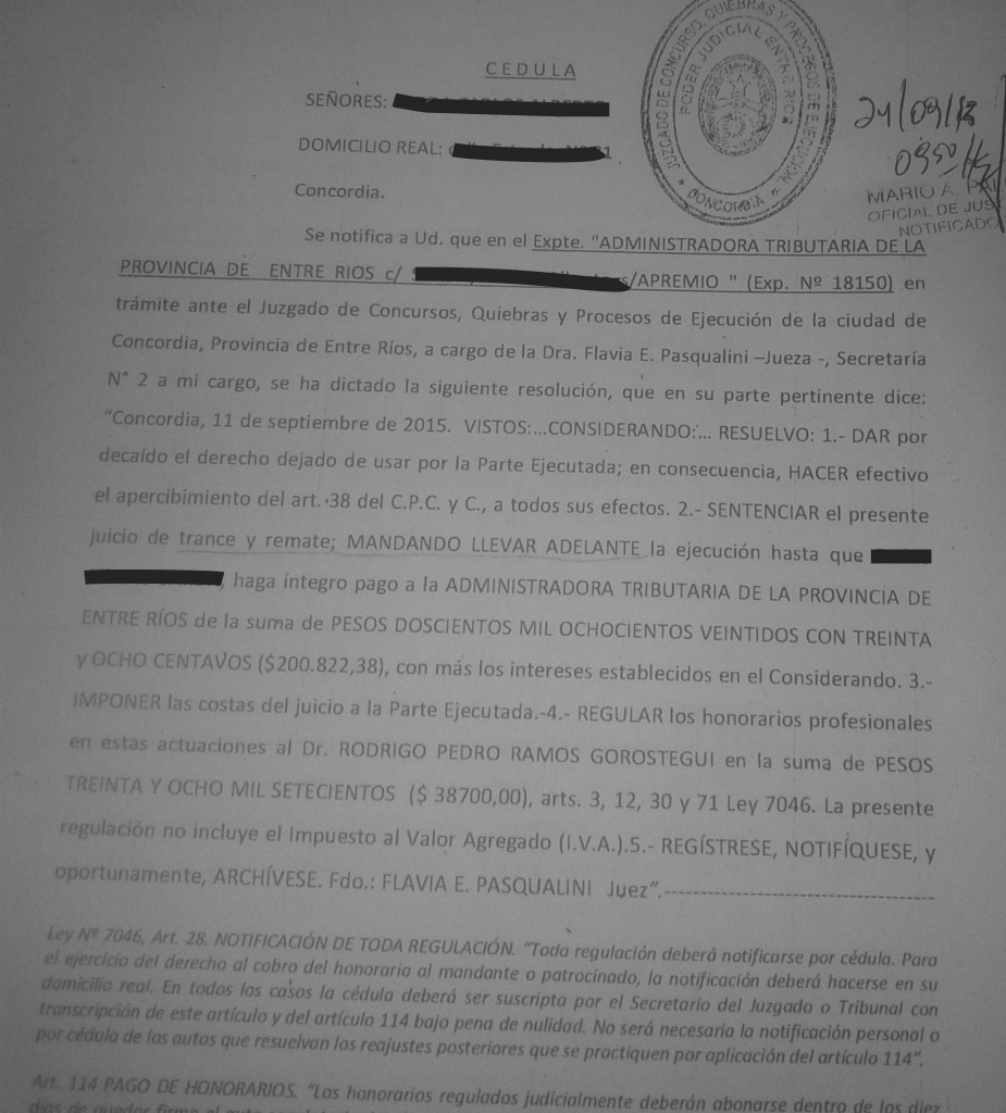 La Provincia envió cédula de remate por deudas del Impuesto Inmobiliario a un contribuyente de Concordia por el atraso en el pago de un anticipo correspondiente a propiedades rurales, cuya carga tributaria se vio multiplicada por seis como consecuencia de la aplicación del impuestazo aprobado a fines de 2013 y que rige desde 2014.