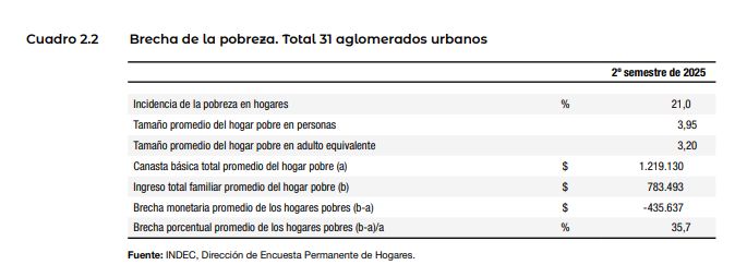 El porcentaje de hogares por debajo de la línea de pobreza (LP) alcanzó el 21,0%; en ellos reside el 28,2% de las personas. Dentro de este conjunto, el 4,8% de los hogares están por debajo de la línea de indigencia (LI), que incluyen al 6,3% de las personas. Esto implica que, para el universo de los 31 aglomerados urbanos de la EPH, por debajo de la LP se encuentran 2.145 mil hogares, que incluyen a 8.474 mil personas; y, dentro de ese conjunto, 494 mil hogares se encuentran por debajo de la LI, lo que representa 1.884 mil personas indigentes.