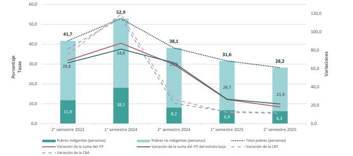 La pobreza perforó el nivel clave del 30% en el segundo semestre de 2025 y afectó al 28,2% de los argentinos, mientras que la indigencia alcanzó al 6,3% de personas, según informó esta tarde el Instituto Nacional de Estadística y Censos (INDEC). Esto implica que, extrapolado al total de la población, unas 13,1 millones de personas están debajo de la línea de pobreza, de las cuales 2,9 millones se encuentran en condición de indigencia.