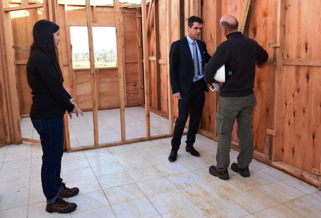 «Para llegar a esta instancia llevamos alrededor de un año trabajando con todo lo que es infraestructura y que el lugar esté en condiciones para el ensamble de las viviendas, que son armadas en talleres», puntualizó la titular del Instituto de Viviendas y Tierras Autárquico Municipal (InVyTAM), Marina Peñaloza, quien junto al Intendente y a la Secretaria de Obras Públicas de la Municipalidad, Mireya López Bernis, realizaron la recorrida por el barrio en construcción. Las viviendas son construidas siguiendo altos estándares y en el marco de las políticas de promoción e industrialización de la producción primaria de la región, que lleva adelante el Intendente Cresto.