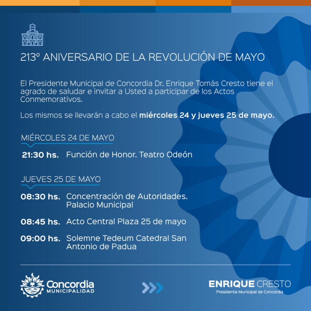 “En nombre del intendente Enrique Cresto invitamos a las instituciones y a toda la comunidad a participar de estas actividades, porque es importante poner en primer plano la relevancia histórica de los acontecimientos de 1810 y porque este tipo de celebraciones hacen también al sentido de argentinidad que todos compartimos”, comentó al respecto el subsecretario de Ceremonial de la Municipalidad de Concordia, Sergio Olivie.
