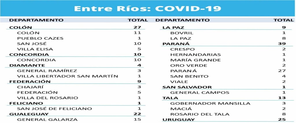 Departamento Colón 27, Departamento Concordia 10, Departamento Diamante 4, Departamento Federación 9, Departamento Feliciano 1, Departamento Gualeguay 22, Departamento Gualeguaychú 27, Departamento Islas del Ibicuy 5, Departamento La Paz 9, Departamento Paraná 39, Departamento San Salvador 1, Departamento Tala 13, Departamento Uruguay 25, Departamento Victoria 2, Departamento Villaguay 2. De ese modo, en la provincia son 50.674 los casos confirmados.