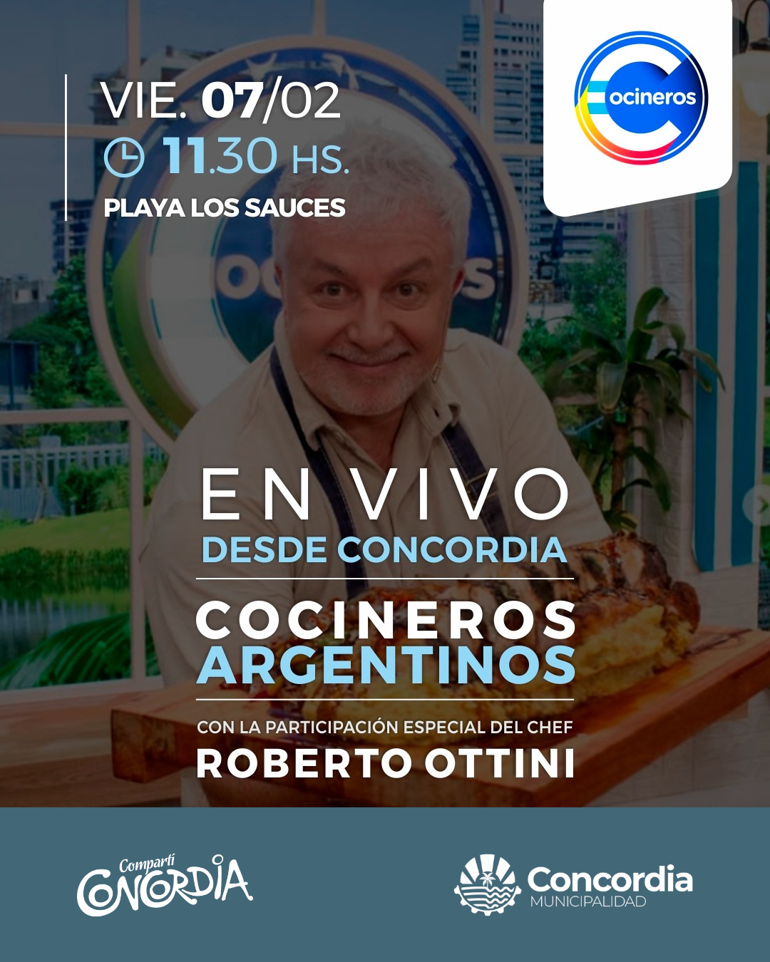 Este viernes 7, el programa Cocineros Argentinos realizará una transmisión especial en vivo desde Concordia a través de América TV. La jornada contará con la participación del chef Roberto Ottini, quien compartirá su talento y conocimientos gastronómicos.
